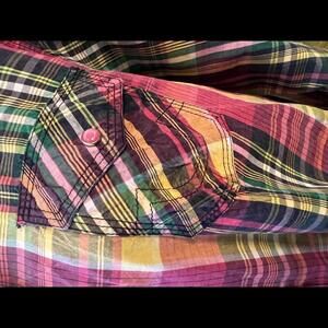 Wired Heart cotton button snap front w/ front pockets. Pink, green, yellow plaid