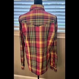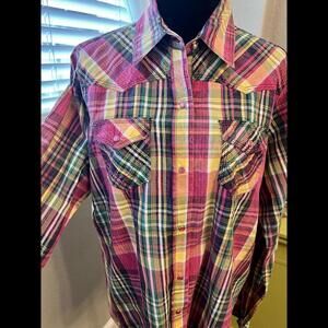 Pre owned plaid western style ladies top. Size XL pink pearl snap buttons