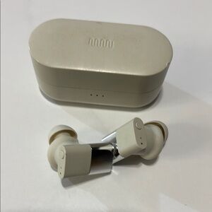Compact and stylish wireless earbuds charging case in a sleek cream color. Perfect for on-the-go charging.