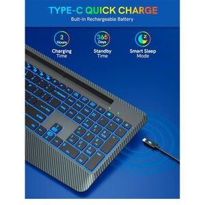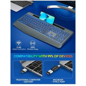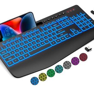 Trueque Wireless with 7 Colored Backlits, Wrist Rest, Phone Holder, Rechargeable Ergonomic Computer Silent Keys, Full Size Lighted for Windows, MacBook, PC, Laptop