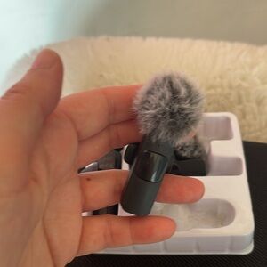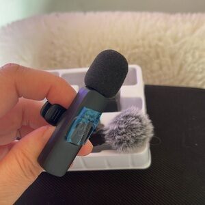 Compact wireless microphone set with gray windshields. Ideal for clear audio recording. Used it a few to test out I got a ton of mic so I’m not honestly using it now. The inside box comes with it can’t seem to find the entire box. One mic was never used the other mic I tried out . This is for the iPhone very