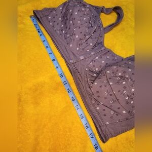 Sport bra style. Wireless, unlined. Functional snaps. Deep lavender color with floral design.