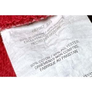 Condition: Good used condition. Visible general wear throughout. There is a faint stain on the front lower torso (see photo 2). There is also a loose thread and minor fabric snag on the right arm sleeve stripe (see photo 5). Overall, item shows light pilling and small blemishes consistent with moderate use. Please review photos for details and flaws.