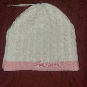 Pink Wisconsin Badgers stocking cap one size fits most. Embroidered 'W' on one side and Badgers on the other. Detailed white knitting pattern on the outside, smooth pink knitting on the inside. Super cute! Brand new with tags.