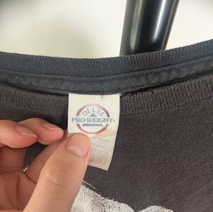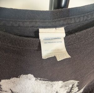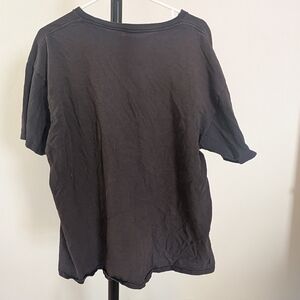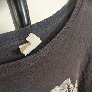 black graphic tee showing the shape of the state of Wisconsin fading into a forest of pine trees. some wear on graphic and collar as shown in photos.