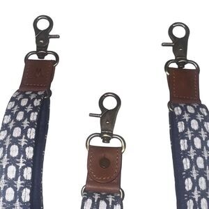 Cotton blend and come in a checkered design in the colors Blue and White. They feature Camel Brown-leather parts and come in our Slim width size (1 inch / 2.5 cm) with Brass-colored metal parts. Explore the Speciality Fabrics collection for more fabrics and colors.