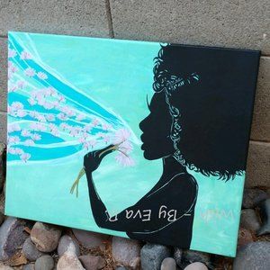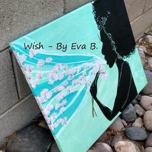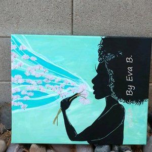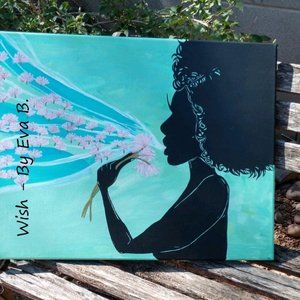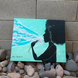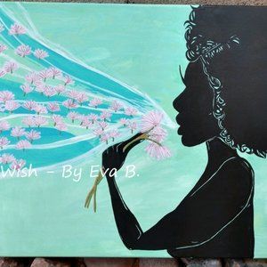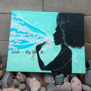 “Wish”. This Hand Crafted acrylic painting features a beautiful woman, with wild curly hair blowing away the tufts of three dandelions, wishing on each thistle as it floats into the sky. Silhouette style painting has multiple colors including blue, teal, green, turquoise ,violet , black ,white ,red ,pink , and gold. Painting was made using pencil, ink, and acrylic paint, with an acrylic clear coat for water resistance. Painting was done on 16x20 stretched cotton canvas. Painting is unframed. .**ALL ITEMS FROM PET FRIENDLY/SMOKE FREE ENVIRONMENT.**