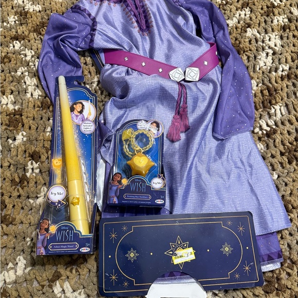 Purple costume dress 4-6x new. Comes with accessories. Includes 2 new wands and 1 new light up star necklace.