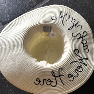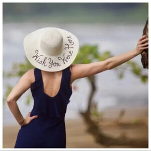 Send your sentiments to friends and family back home while on vacay! This A+ hat by Tart has adjustable strings at interior to create the right fit for you. Font is a super dark navy to black and pairs with either color or any other color for that matter! From my personal closet, this hat was worn once and for that, there is a huge discount! Dress from Bloomingdales available in another listing.