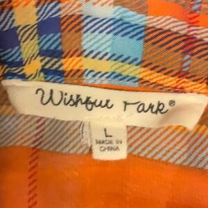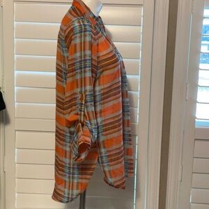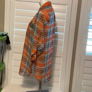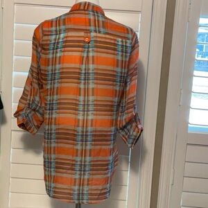 Stylish plaid blouse with vibrant colors. Features a button-up front and three-quarter sleeves. Perfect for casual wear.