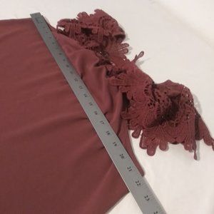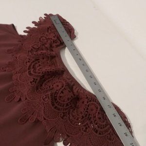 wishful women's size 1X medium mulberry color sleeveless blouse, crochet detail around shoulder and neck line, there are some slight markings which i cant tell what it is but they are really hard to see while blouse is on but its easier to see if you are looking at it in the light when it is not on. the+ re are like 4 or 5 little lines. shown on the last picture which I circled one of the marking because the other ones are hard to see but they are all in the same little area. shown on the last picture