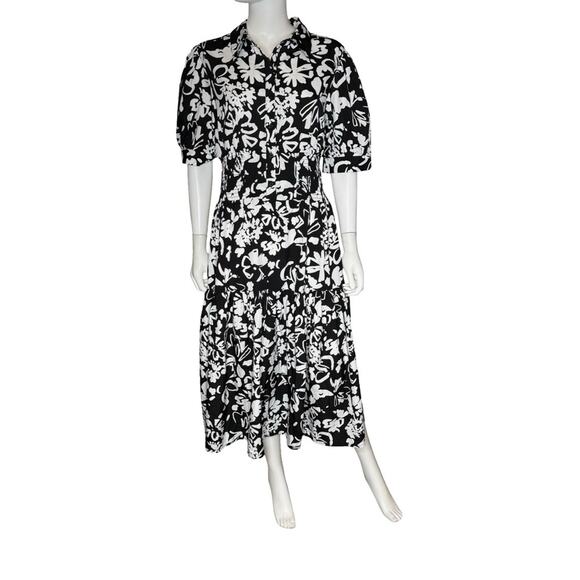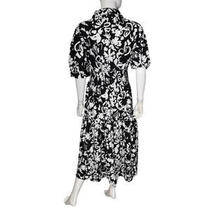 Wishing Waves Black and White Notched Collar Puff Sleeve Midi Dress Women’s Sz L