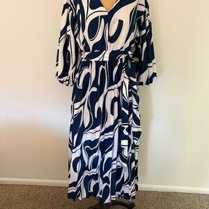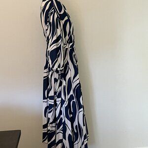 Wishing Waves Calf Length Pleated Dress in Blue and White with Tie On Belt - Med