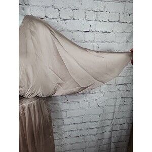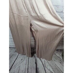 This beautiful beige satin romper from Wishlist Apparel is a stylish addition to any wardrobe. With its silky fabric and flattering fit, wide flowing legs, and winged sleeves, it's perfect for any occasion. The romper comes in a women's size medium. 55" legnth 28" waist. It is in great preowned condition. It is lined with shorts and has pockets