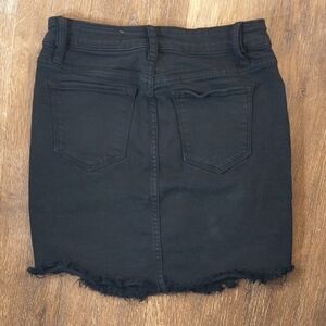 Elegant dark denim skirt. Features frayed hem. Perfect for any occasion.