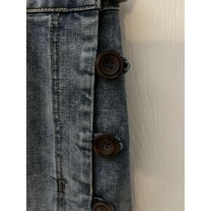 The Wishlist Blue Jean skirt is a stylish addition to any woman's wardrobe. This skirt features side button detail, giving it a unique and fashionable edge. The mini length and size L make it a versatile piece that can be dressed up or down for any occasion. Perfect for those who love to stay on-trend and make a statement with their outfit.