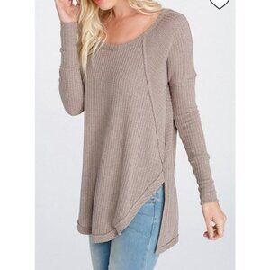 Details: Long sleeve waffle knit top featuring a side slit. Pair this top with your favorite fall vest and beanie for a cute chilly day outfit. You could also pair this top with your favorite sweatpants for a lounge look.