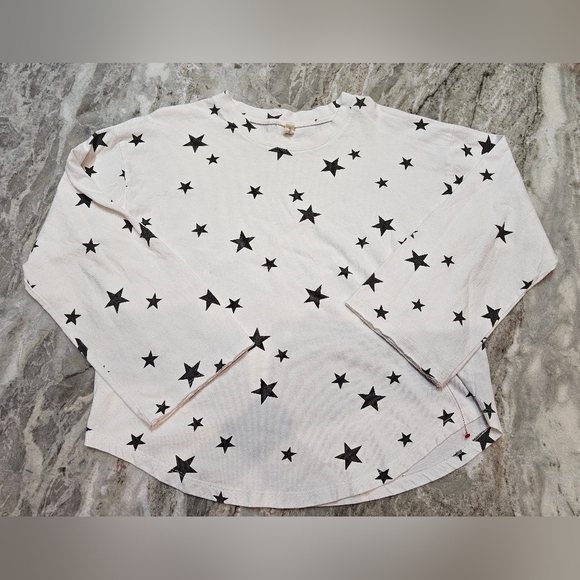 Cute and comfy, this Wishlist star print tee is made from 100% soft cotton and features a fun allover black star pattern on a crisp white background. Lightweight and breathable—perfect for lounging, errands, or layering year-round. Classic crew neck with short sleeves. Size Small.