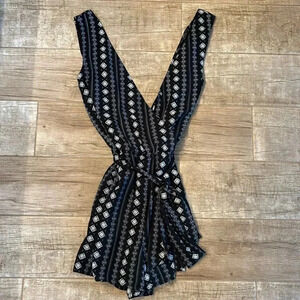Item: navy blue and white polyester lined shorts romper. Vneck front and back.