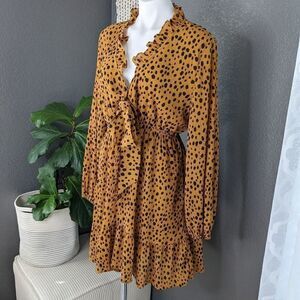 Boho inspired Desert Rain Dress with feminine ruffles and flowing sleeves. Elastic waistband and cute tie bow at the neck. Bottom half is lined.