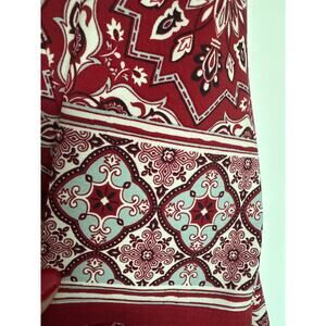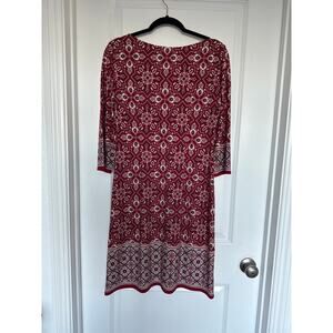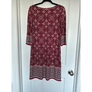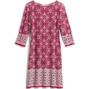 From StitchFix. Cute kerchief and medallion print shift dress with stretchy knit, bateau neckline and 3/4 sleeves.