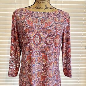Wisp Knit Dress Size 12 Pink Paisley Sheath Boat Neck Long Sleeve Pullover.