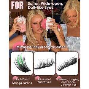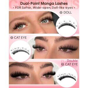 🧿1. Dual-Point Design for Elegant, Doll-Like Eyes Achieve the highly sought-after, softer wide-eyed look with our manga lash clusters. The unique Dual-Point design mimics your natural lash line with a flattering C-curl, delivering a delicate yet eye-opening effect.