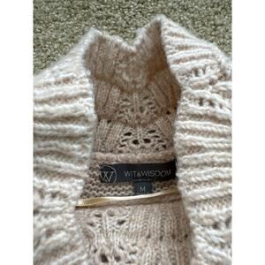 Wit & Wisdom mock neck sweater in a soft wool blend (95% polyester, 5% wool). Size M. Features ribbed knit detail, wide shoulders, and a relaxed cropped silhouette. Neutral cream tone pairs easily with denim, skirts, or layered over dresses.