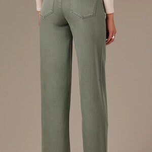 New w/o tags. Wit and Wisdom - Sam Absolution High-Waisted Wide-Leg Jeans in Green. Size 10. Very comfy, classic casual, great silhouette. 32" inseam; 24" leg opening; 12" front rise; 17" back rise. 60% cotton, 22% rayon, 17% polyester, 1% spandex.
