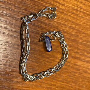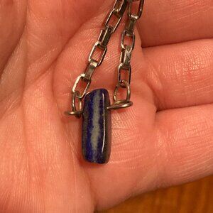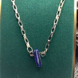 Hanging from a stainless steel rectangular link chain is a single sodalite stone.