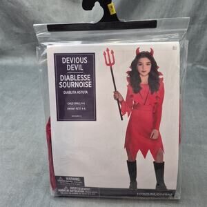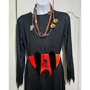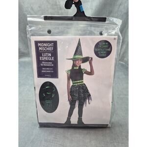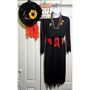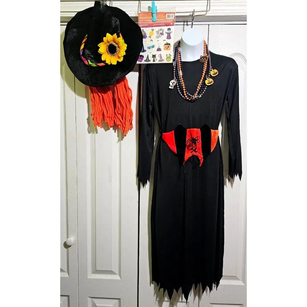 Witch Costume Girls 8-10 Dress Wig Hat Orange Belt Necklace Tattoo Halloween Set