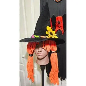 • Witch Hat with striped band, sunflower, and yarn hair pigtails