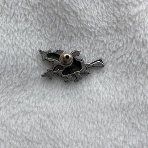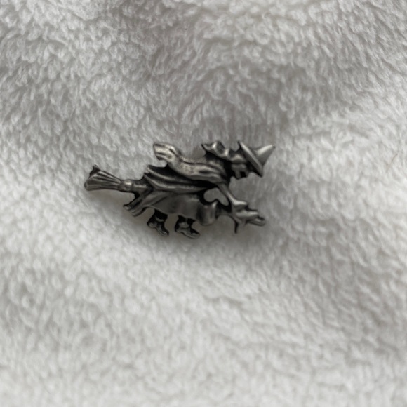 Little pewter witch on her broom lapel pin. Great Fall accent for jean jacket or hat tack pin.