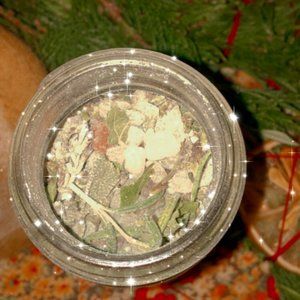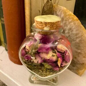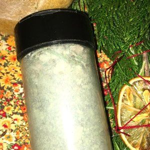 "Witches' Hedgerow" Bath Salt or Ritual salt with black volcanic salt, French green clay, pink Himalayan salt, and an assortment of garden herbs and flowers such as rosemary and sage. These have a mild greenish hue from the French green clay- not the most decorative of my bath salts but functional! These are used for cleansing, detoxing, and protection.