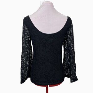 Witchy Boho Chic Black Lace Bell Sleeve Scooped Back Stretch Womens Top Medium