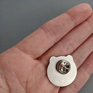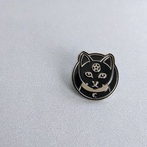 Witchy Goth Black cat lapel pin brooch. The cat has a pentagram star on its head and a moon below its collar. Black enamel set in silver tone metal, pin has a metal clasp backing. Approximately 1” high. Item is New.
