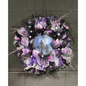 Add a hauntingly beautiful touch to your spooky season with this handcrafted Halloween wreath! Featuring a striking silhouette of a witchy mother and child under a moonlit sky, this unique wreath blends gothic charm with whimsical detail. Layers of purple, black, and silver mesh are accented with sparkly bats, moons, and witch ribbon, plus glittery picks and faux webbing for that perfect spooky texture.