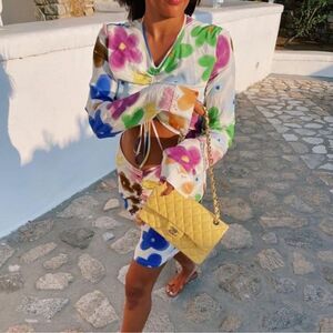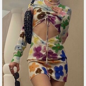The Hermana Dress is a long sleeve, mini length dress accompanying a v cut neckline and waist with an adjustable front