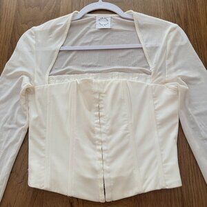 constructed, corset style top with boning, hook and eye closure and long mesh sleeves