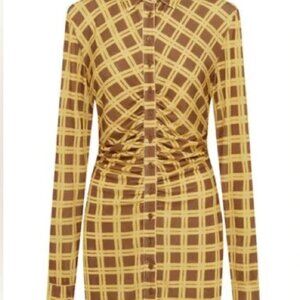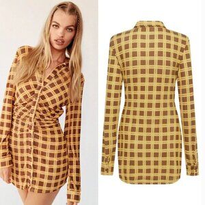 The Andy is a long sleeve mini dress featuring a ruched waist and button-through front.