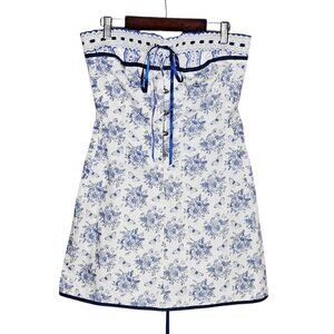 With Jean Sabrin Toile Papillon Strapless Floral Blue White Mini Dress Size M