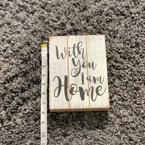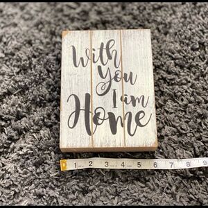 Horizontal Shape, Faux Wood Grain with Distressed White Paint and Black lettering.