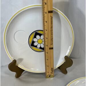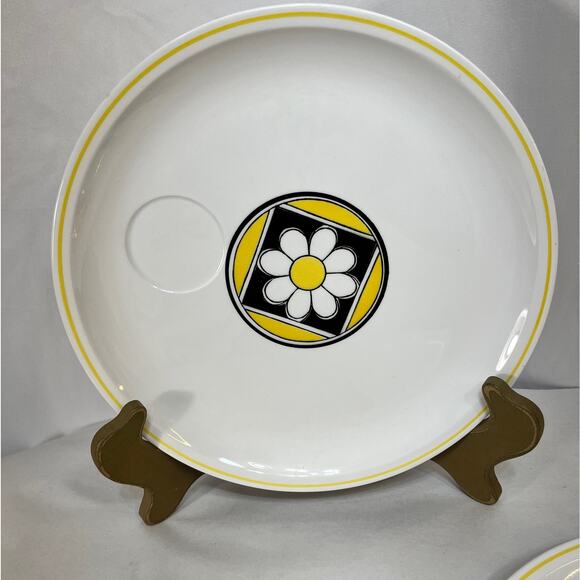 Very good preowned condition set of snack/luncheon plates. White with yellow and black center daisy/flower. 9.25" plates. #4081 "Within" Pattern. No chips or cracks. Mikasa by Jonas Roberts. Mediterrania, Black & Yellow, Daisy