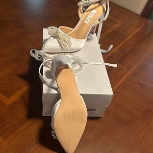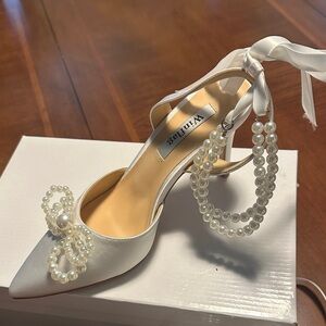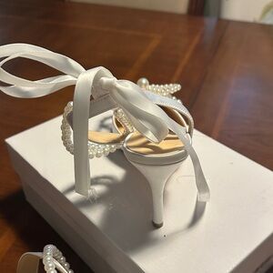 Chic white heels with pearl bow accents. Ideal for elegant events. Stylish and sophisticated. Never worn