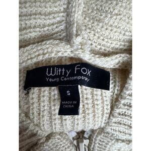 This cozy Witty Fox knit sweater features a soft cream base accented with green stripes for a timeless yet trendy look. Designed in a cropped, slouchy fit, it’s finished with a matching cream-colored zipper and hood for laid-back style. Women’s size small, with exact measurements shown in photos to ensure the perfect fit. A versatile piece that layers easily for casual everyday wear or a chic, relaxed vibe.