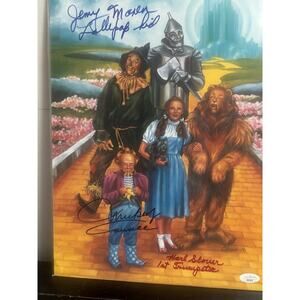 This 11”x14” portrait is hand signed by the late Jerry Maren - inscribed “Lollipop Kid”, the late Mickey Carroll - written over the munchkin character he played, and Karl Slover - inscribed “1st Trumpeter.” The portrait features a signature-authentication hologram in the bottom right corner which confirms that this document includes 3 original cast member signatures. Finally, the portrait comes with a 3”x5” authentication certificate which corresponds to the hologram on the front.