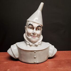 TIN MAN=His condition is good overall. He does have a few chips in his glazing. One notable at the top of his funnel, but no cracks or any other damage. Measures approx. 8" tall x 7" wide x 4" deep.