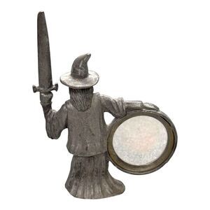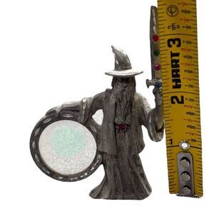 This pewter wizard figurine features intricate details, including a crystal ball and a jeweled sword. Crafted by Spoontiques, it combines craftsmanship with fantasy elements. The piece stands at approximately 3 inches tall, offering a unique decorative accent for collectors or enthusiasts of mystical artifacts.