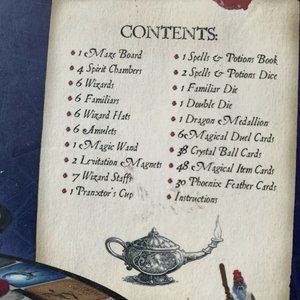 This listing is for a used game, "Wizardology The Game" by Sababa Toys, 2007 edition. This game is in good overall condition and all the actual pieces are there. I took pictures of everything and I think the set is complete. The box does have some wear but it’s in great condition. I tried to take pics from every angle.