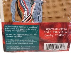 Includes: 14 Count plastic canvas, 6 strand cotton floss, wire for hanging, needle, graph, finishing instructions.